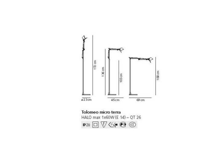 Lampa Tolomeo Micro Terra składa się z dość ciężkiej podstawy, dwóch ramion połączonych przegubami z mechanizmem napinającym stalowe linki pozwalającymi ustawić lampę w dowolnej pozycji i małego klosza. Ramiona lampy wykonano z aluminium. Całość można dowolnie wyginać, dzięki czemu lampa oświetla dokładnie to co chcemy. Mechanizm Tolomeo pozostał nieosłonięty, czyniąc wygląd lampki zdecydowanie industrialny i kosmiczny.