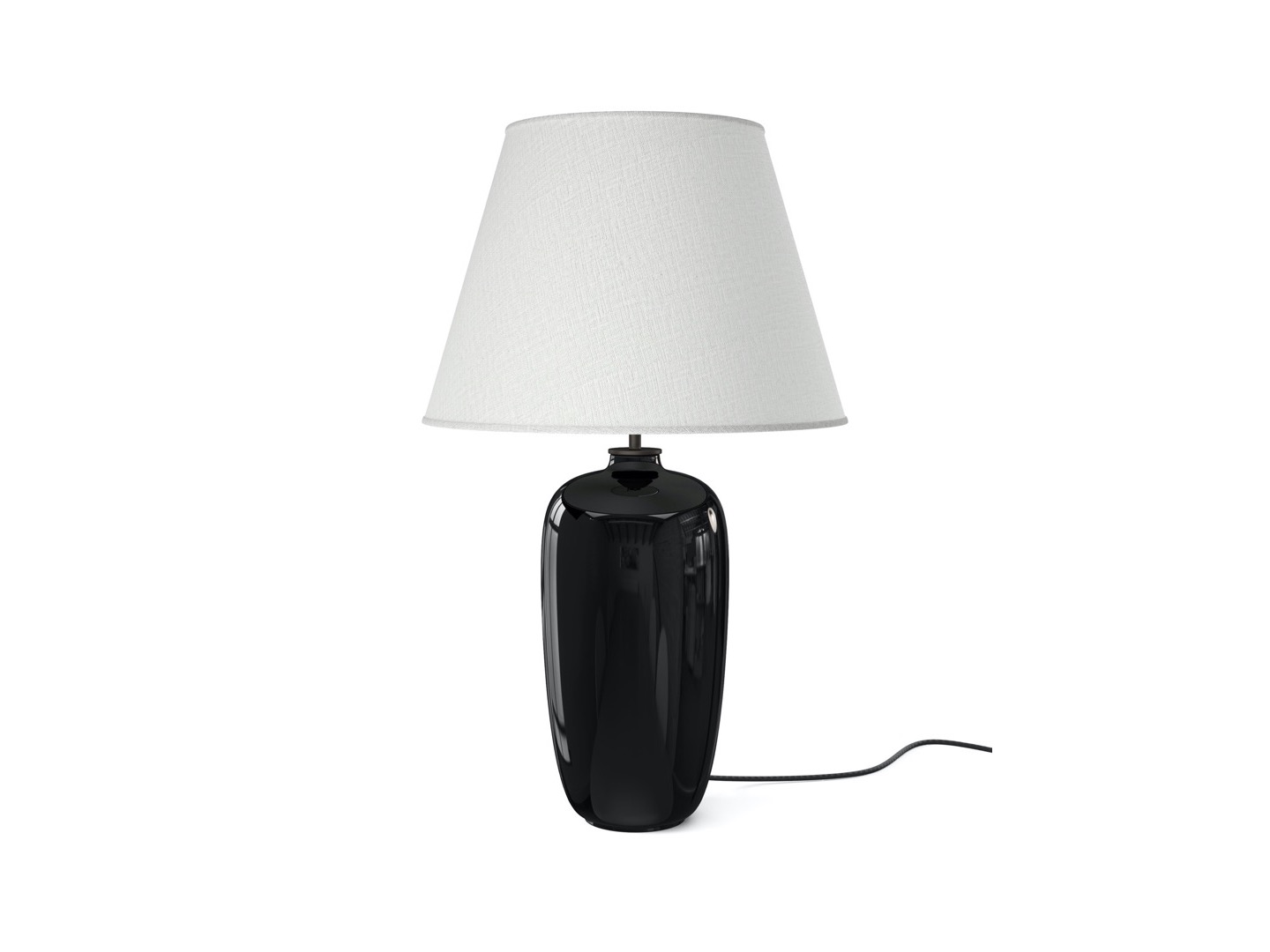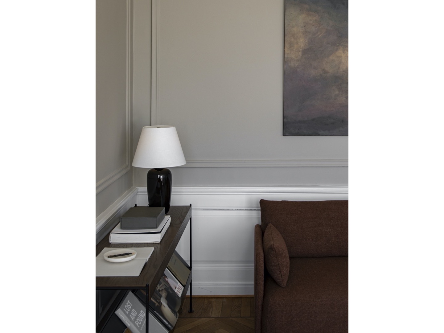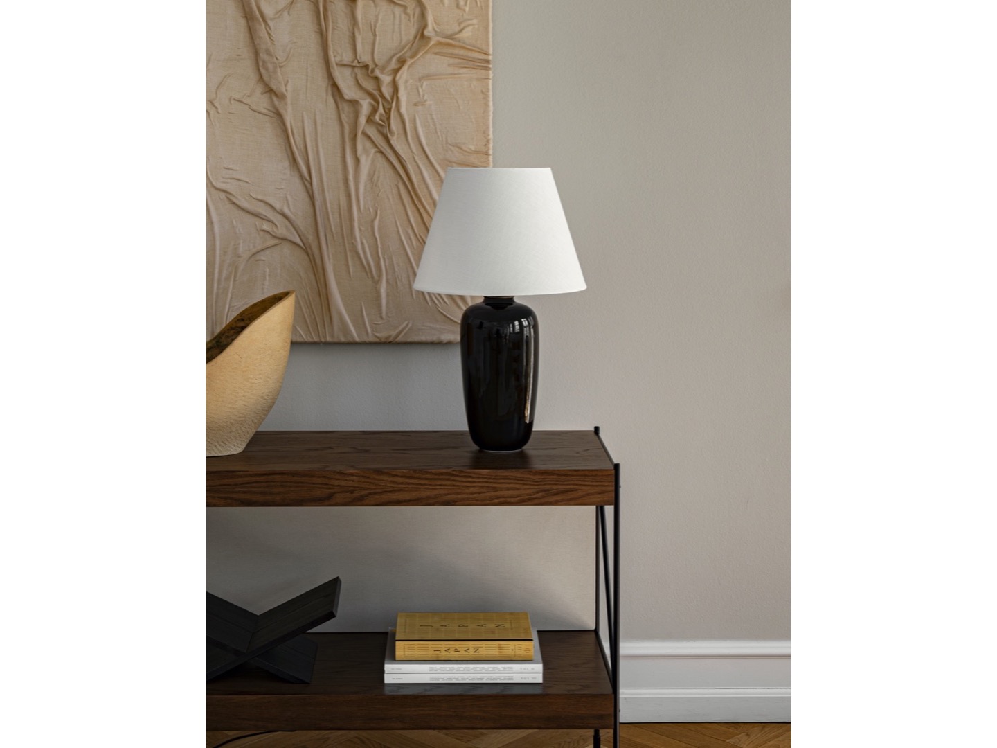 Lampa stołowa Torso firmy Krøyer-Sætter-Larsen, zaprojektowana została z ponadczasowym wyglądem, który nadaje się do każdego ustawienia. Podstawa odlana z czarnej glazurowanej kamionki i wydłużona dla subtelnego, ale rzeźbiarskiego wyrazu. Ściemniacz dotykowy z mosiądzu pozwala na indywidualne ustawienie intensywności światła.
