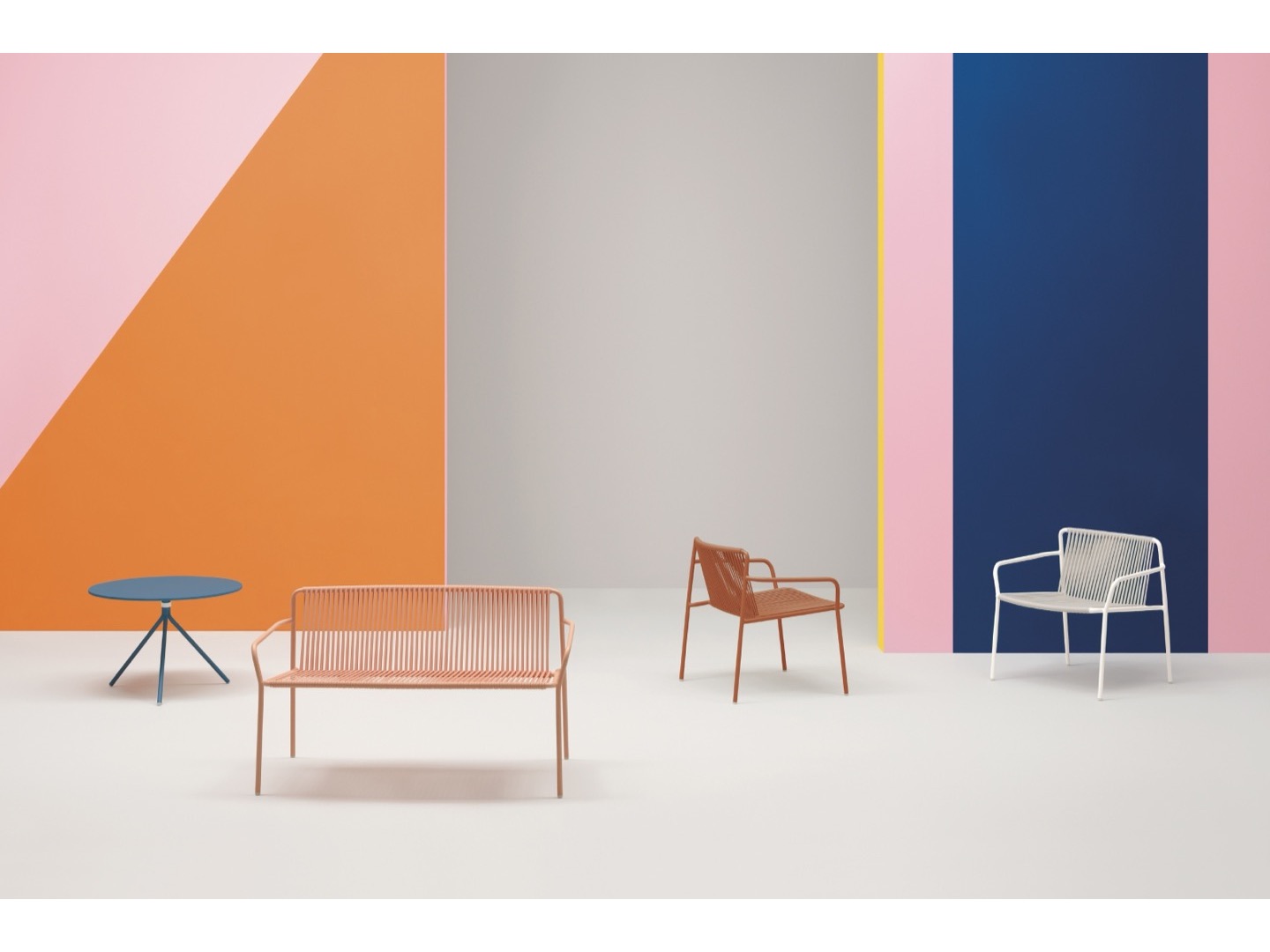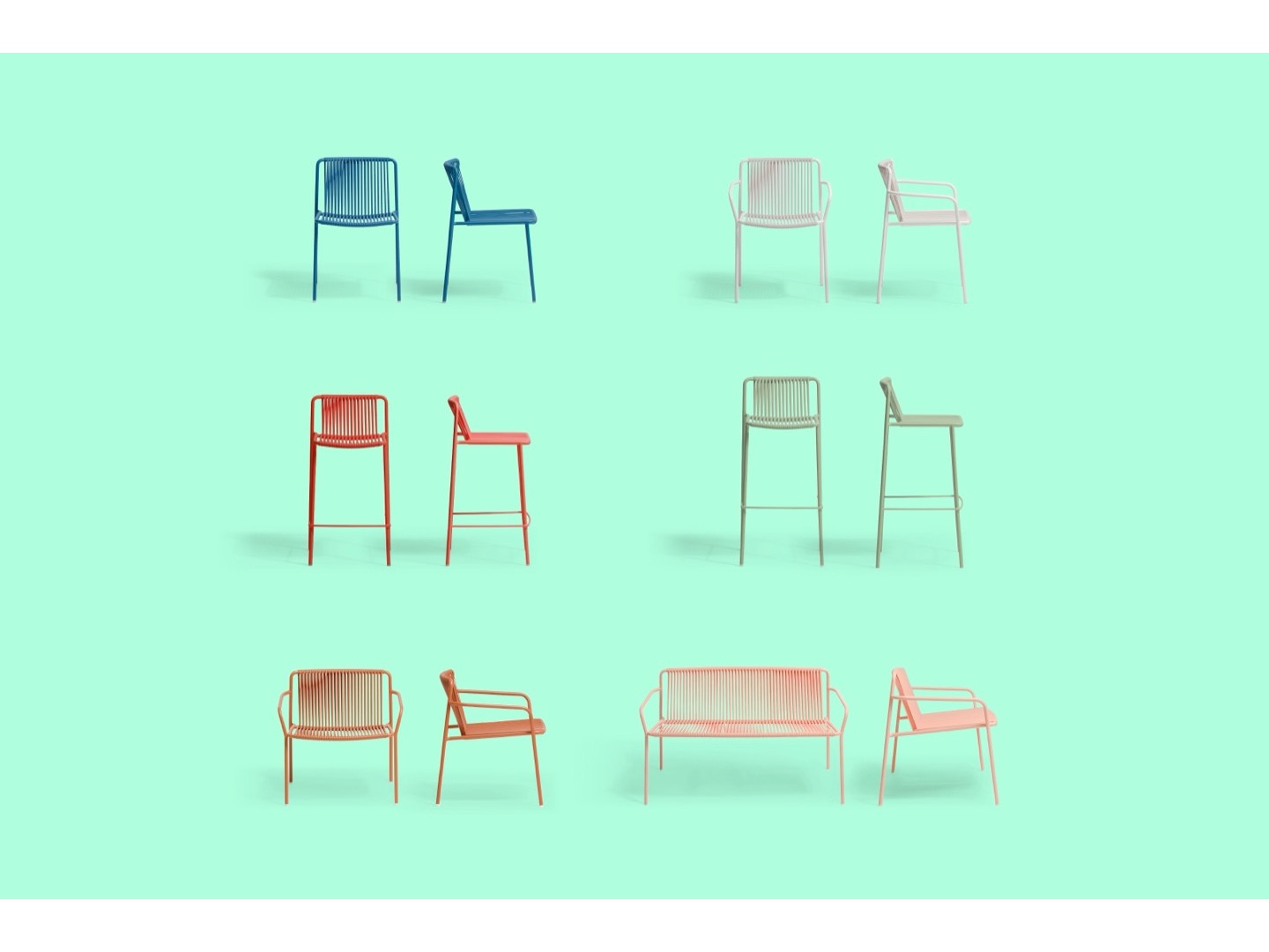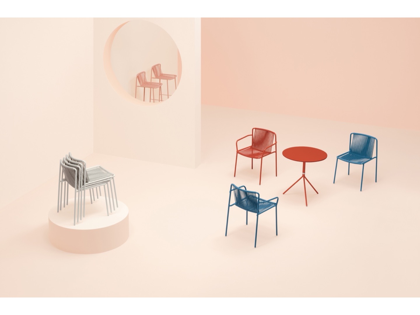 Tribeca to nowoczesna reinterpretacja klasycznych krzeseł tarasowych z lat 60., wykonanych ze stali z plecionym wzorem.