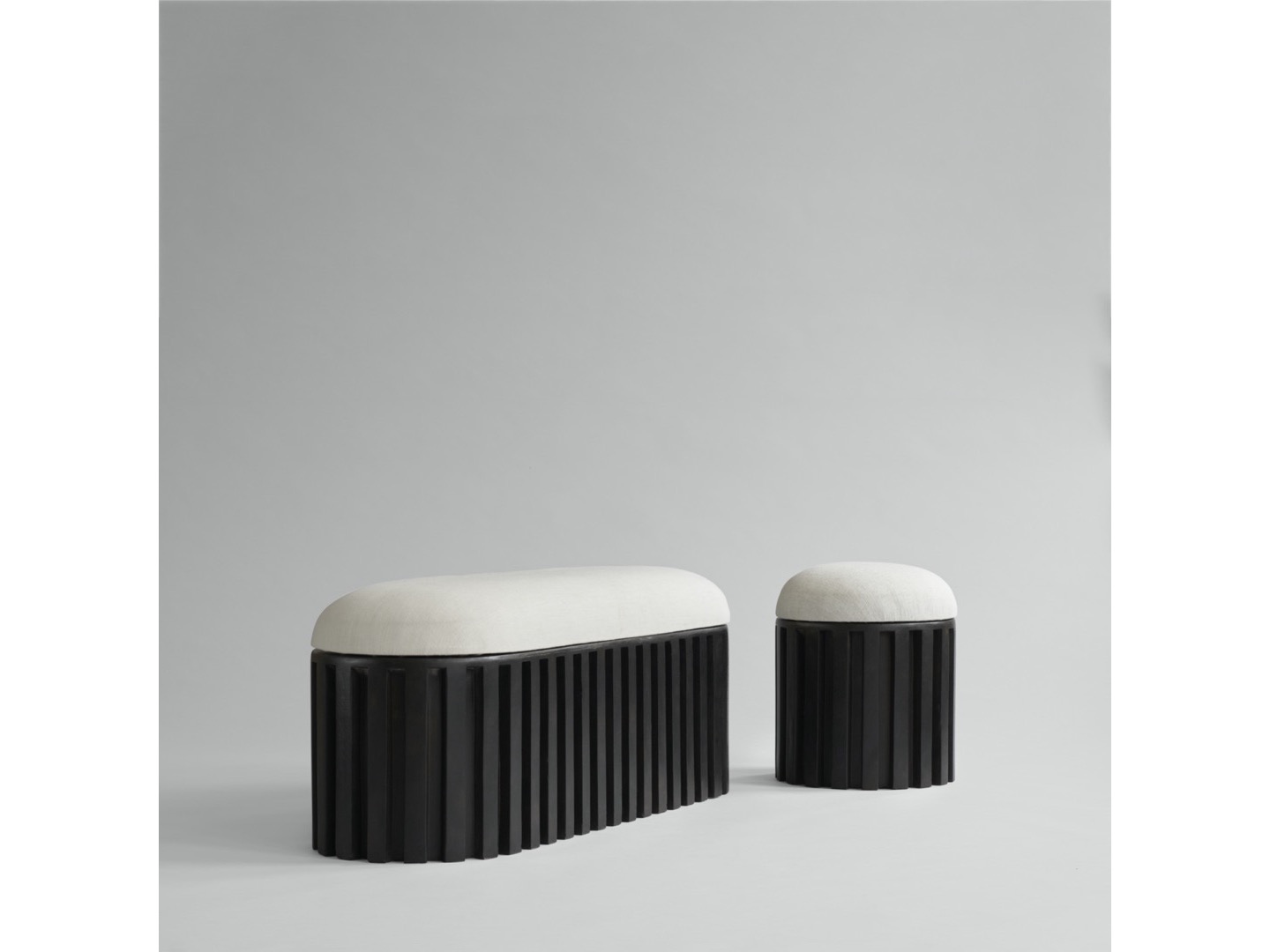 Kolekcja Tribu składa się z ławki i pufy odlanych z lekkiego betonu włóknistego oraz poduszki z płótna w kolorze kredy.