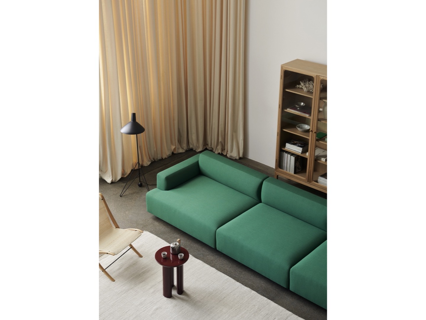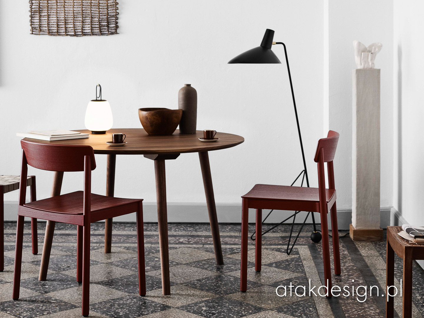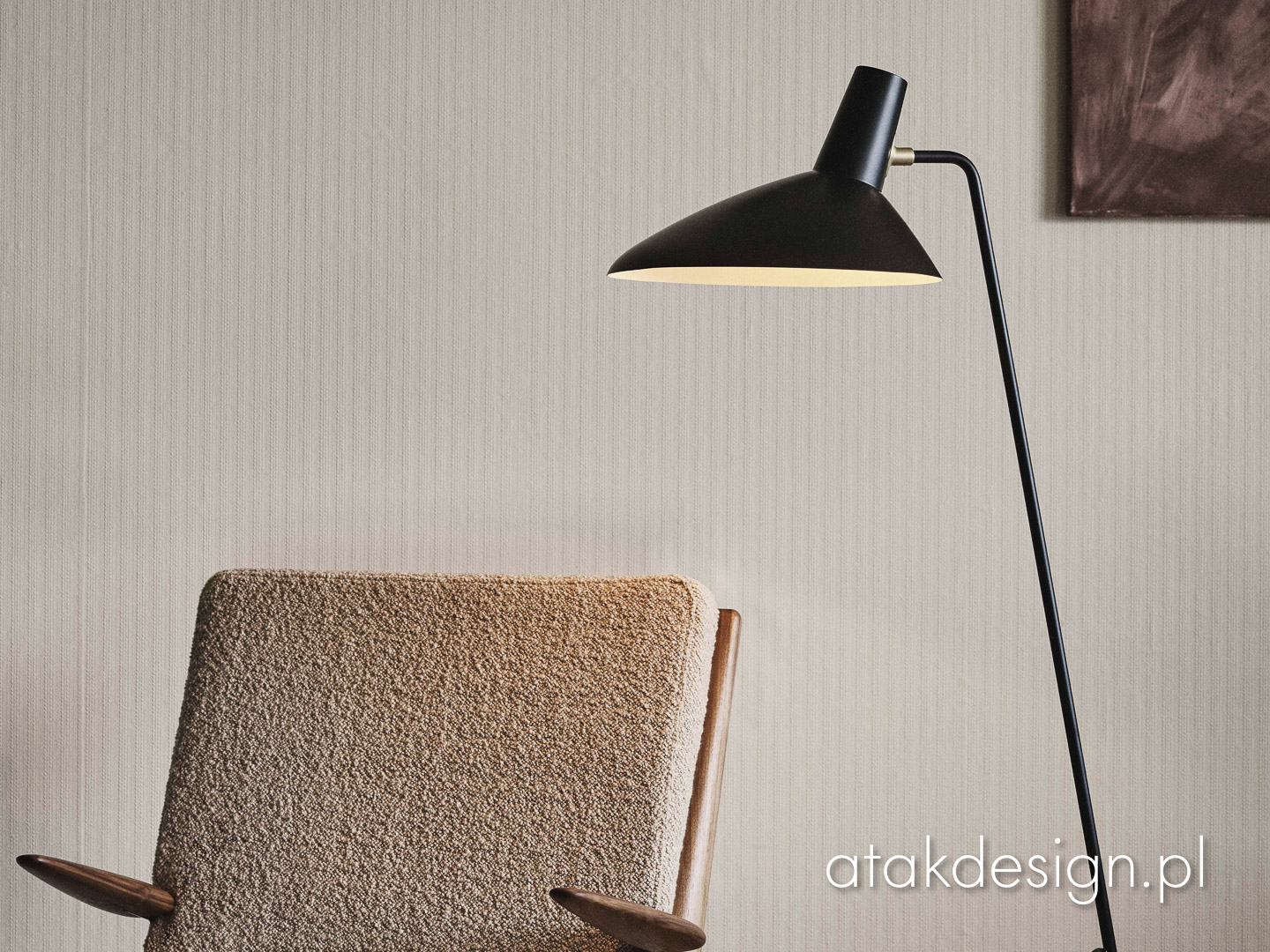 Lampa Tripod z 1953 roku odzwierciedla czysty minimalizm Old Masters Hvidt & Mølgaard. Lampa podłogowa zbudowana z lakierowanej stali z mosiężnymi detalami, zapewnia delikatną równowagę pomiędzy surową prostotą swojego projektu a miękkością nadawaną przez zakrzywione krawędzie podstawy. Teraz dostępna w trzech nowoczesnych kolorach: Black, Maroon i Moss.