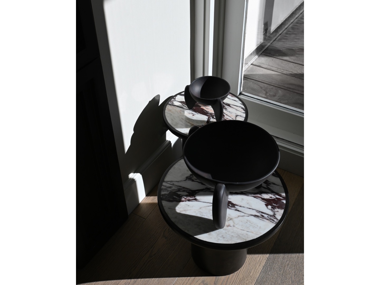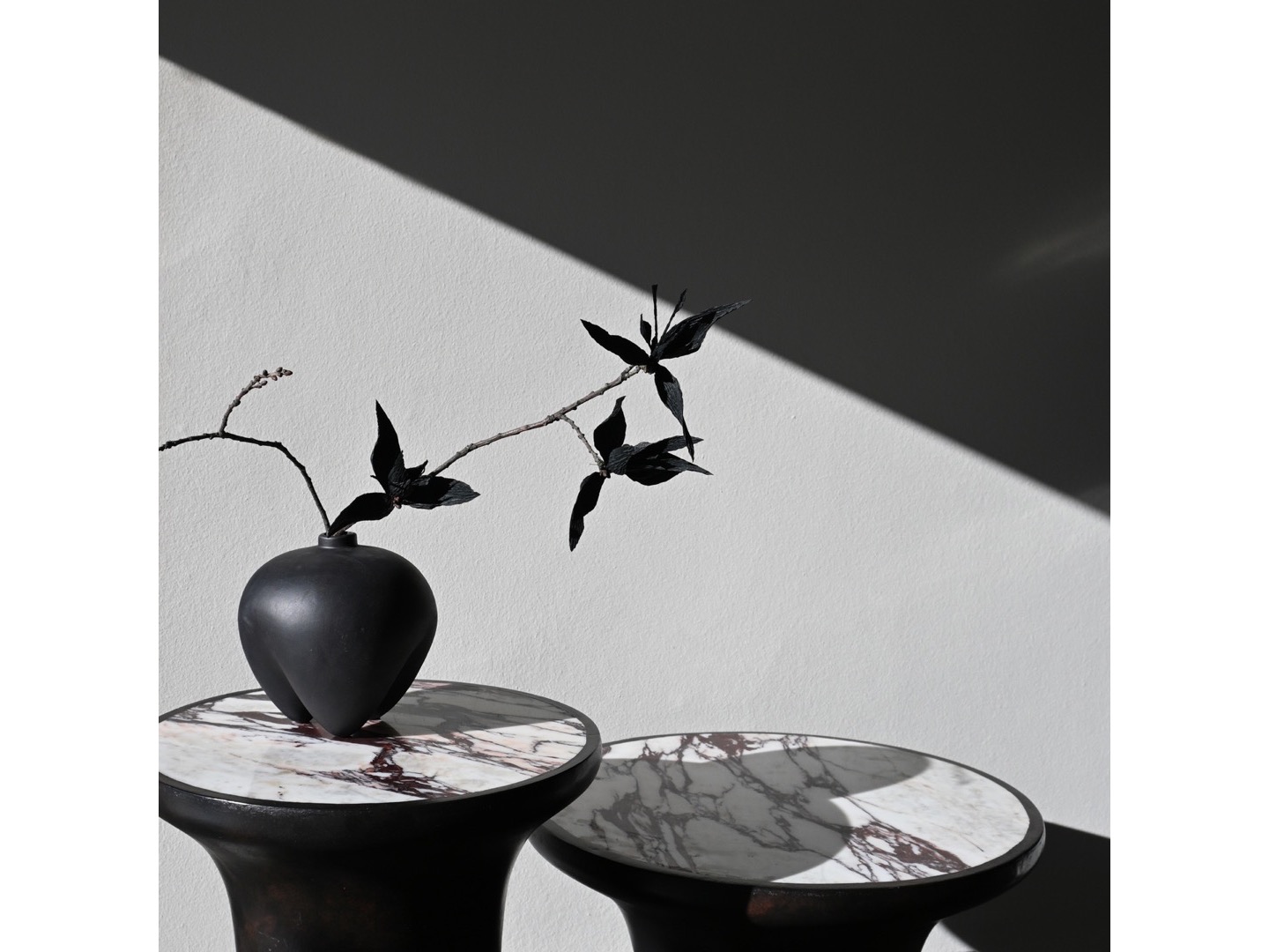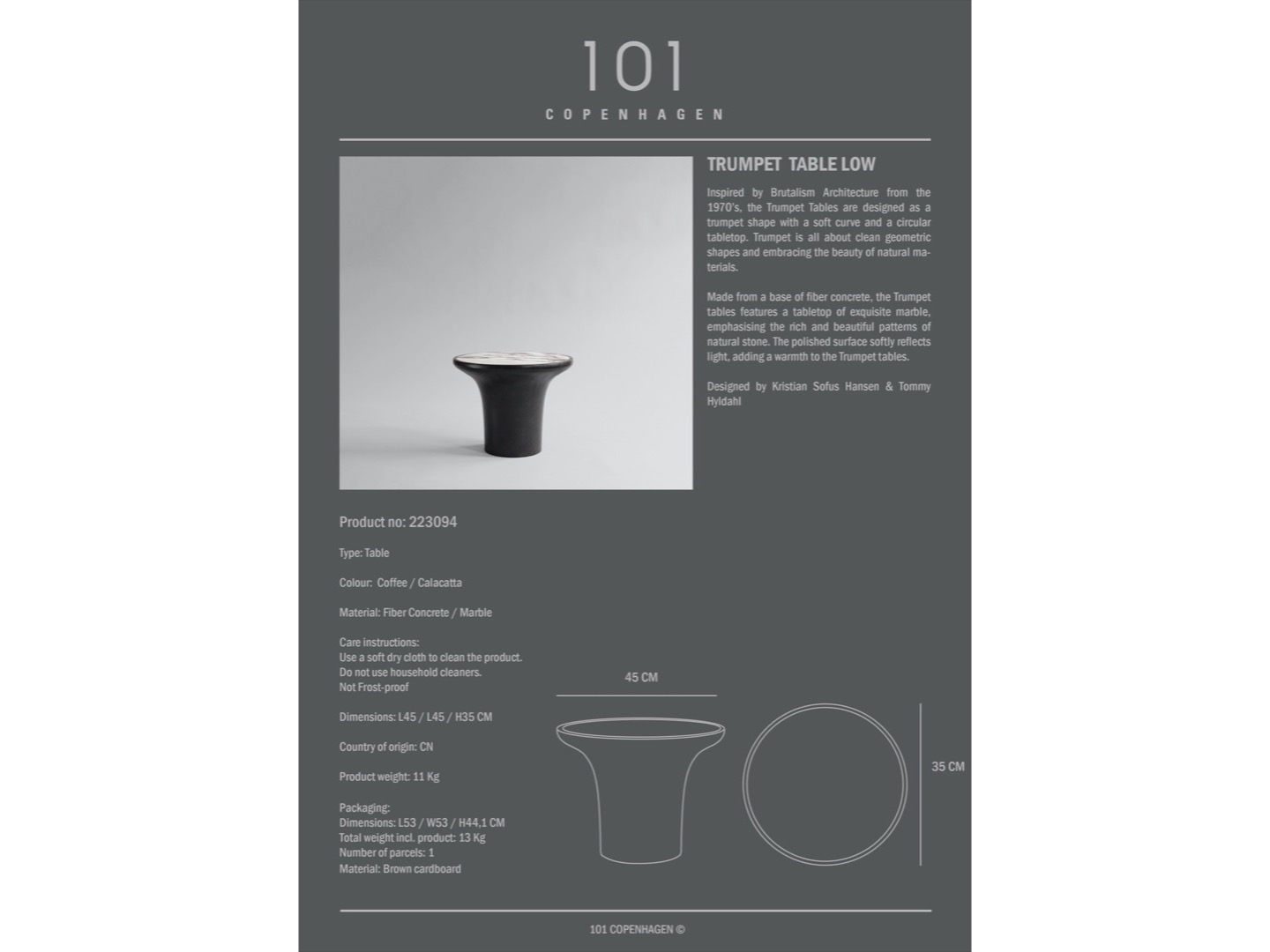 Zainspirowane architekturą brutalizmu z lat 70. Trumpet Table zostały zaprojektowane w kształcie trąbki z miękką krzywizną i okrągłym blatem. Trumpet to czyste geometryczne kształty i uchwycenie piękna naturalnych materiałów. Wykonane z podstawy z betonu włóknistego, i marmurowego blatu, podkreślającego bogate i piękne wzory naturalnego kamienia. Polerowana powierzchnia miękko odbija światło, dodając ciepła stolikom.