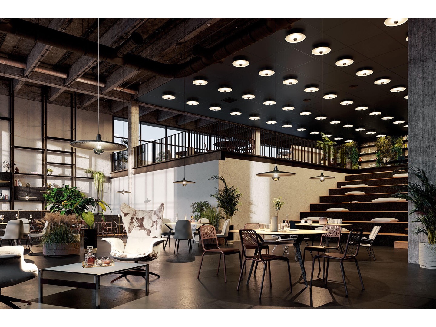 Dynamiczny design sprawia, że ta dekoracyjna lampa idealnie nadaje się do przestrzeni publicznych. Dostępna w dwóch rozmiarach i wykończeniach.